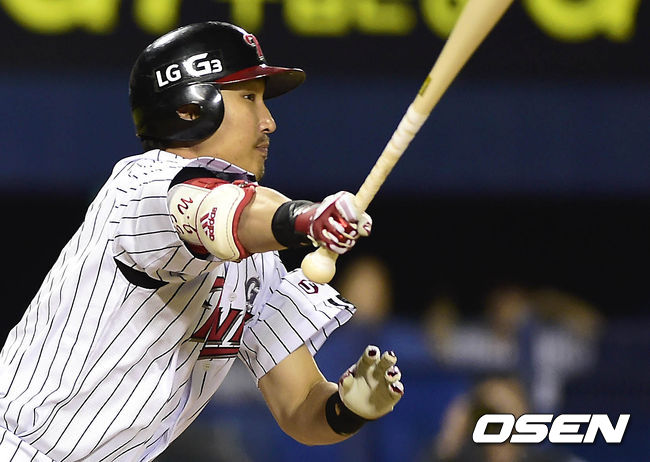 7일 오후 서울 잠실구장에서 열린 '2014 한국야쿠르트 세븐 프로야구 LG 트윈스와 삼성 라이온즈의 경기, 8회말 1사 주자 1,3루 LG 이진영이 역전 적시 2루타를 치고 있다.