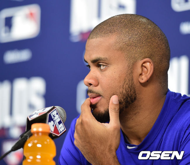 8일(이하 한국시간) 미국 미주리주 세인트루이스에 위치한 부시스타디움에서 열릴 2014 메이저리그 LA 다저스와 세인트루이스 카디널스의 디비전시리즈(NLDS·5전3승제) 4차전, 경기에 앞서 다저스 잰슨이 인터뷰를 하고 있다.