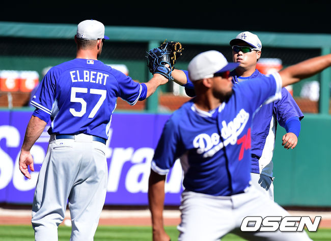 8일(이하 한국시간) 미국 미주리주 세인트루이스에 위치한 부시스타디움에서 열릴 2014 메이저리그 LA 다저스와 세인트루이스 카디널스의 디비전시리즈(NLDS·5전3승제) 4차전, 경기에 앞서 다저스 류현진이 엘버트와 캐치볼을 마치고 하이파이브를 하고 있다.