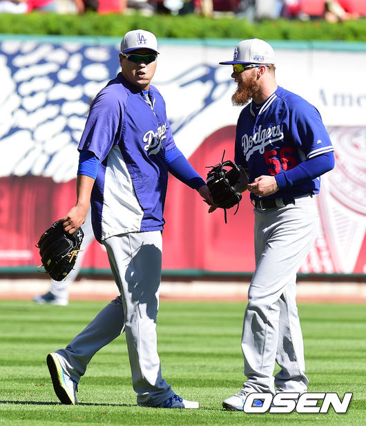 8일(이하 한국시간) 미국 미주리주 세인트루이스에 위치한 부시스타디움에서 열릴 2014 메이저리그 LA 다저스와 세인트루이스 카디널스의 디비전시리즈(NLDS·5전3승제) 4차전, 경기에 앞서 다저스 류현진이 하웰과 이야기를 나누고 있다. 하웰은 3차전 8회말 등판, 위기를 넘기며 2차전 동점 투런포를 허용한 마음 고생을 털고 세리머니를 펼쳤다.