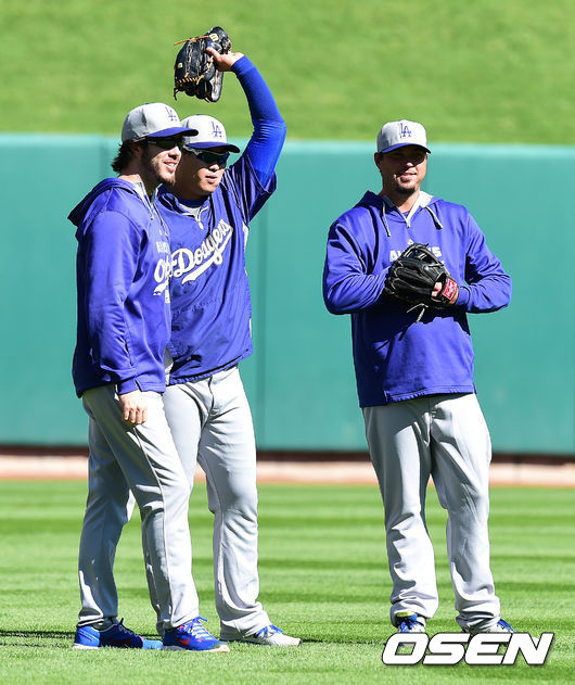 8일(이하 한국시간) 미국 미주리주 세인트루이스에 위치한 부시스타디움에서 열릴 2014 메이저리그 LA 다저스와 세인트루이스 카디널스의 디비전시리즈(NLDS·5전3승제) 4차전, 경기에 앞서 다저스 류현진이 댄 하렌, 조시 베켓과 이야기를 나누고 있다.