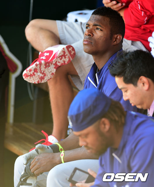 8일(이하 한국시간) 미국 미주리주 세인트루이스에 위치한 부시스타디움에서 열릴 2014 메이저리그 LA 다저스와 세인트루이스 카디널스의 디비전시리즈(NLDS·5전3승제) 4차전, 경기에 앞서 다저스 푸이그가 더그아웃에 앉아 생각에 잠겨 있다. 푸이그는 4차전 선발에서 제외됐다. 푸이그 대신에 이디어가 선발출장.