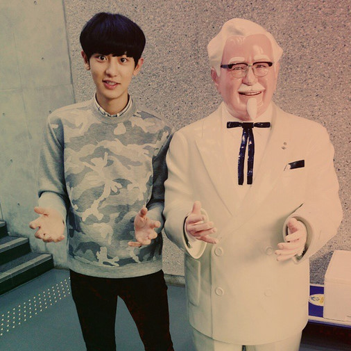 공개된 사진 속 찬열은 한 패스트푸드점의 마스코트인 켄터키 할아버지의 옆에 서서 똑같은 포즈를 취하고 있다. 특히 그는 차분하게 내린 앞머리와 밀리터리 패턴의 맨투맨, 검은 바지로 완벽한 ‘남친룩’을 선보여 보는 이들의 시선을 사로잡고 있다.