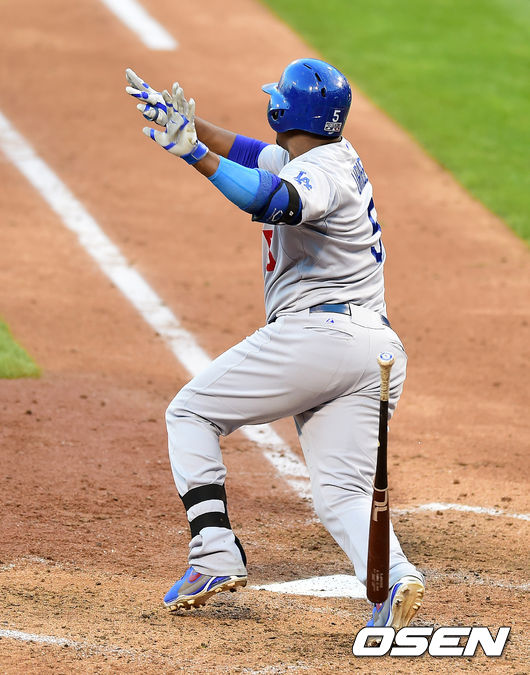 8일(이하 한국시간) 미국 미주리주 세인트루이스에 위치한 부시스타디움에서 열린 2014 메이저리그 LA 다저스와 세인트루이스 카디널스의 디비전시리즈(NLDS·5전3승제) 4차전, 6회초 2사 1,2루에서 다저스 유리베가 1타점 중전 적시타를 날리고 있다.