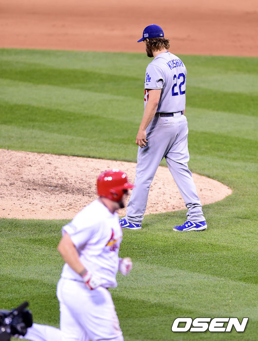 8일(이하 한국시간) 미국 미주리주 세인트루이스에 위치한 부시스타디움에서 열린 2014 메이저리그 LA 다저스와 세인트루이스 카디널스의 디비전시리즈(NLDS·5전3승제) 4차전, 7회말 무사 1,2루에서 다저스 커쇼가 세인트루이스 아담스에 역전 스리런포를 허용하고 아쉬워하고 있다.