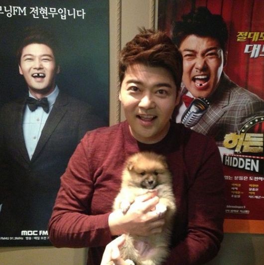 공개된 사진 속 전현무는 강아지를 안고 카메라를 응시하고 있다. 특히 겁에 질린 듯한 표정을 짓는 강아지에 비해 전현무는 해맑은 미소를 지어보이고 있어 웃음을 자아냈다.