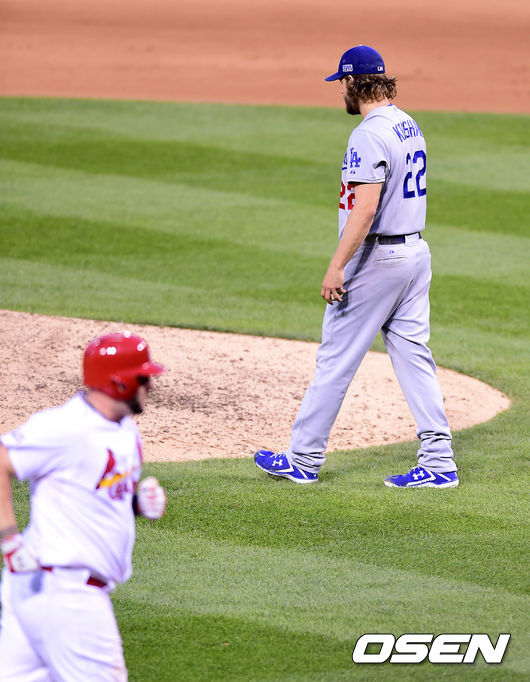 8일(이하 한국시간) 미국 미주리주 세인트루이스에 위치한 부시스타디움에서 열린 2014 메이저리그 LA 다저스와 세인트루이스 카디널스의 디비전시리즈(NLDS·5전3승제) 4차전, 7회말 무사 1,2루에서 다저스 커쇼가 세인트루이스 아담스에 역전 스리런포를 허용하고 아쉬워하고 있다.