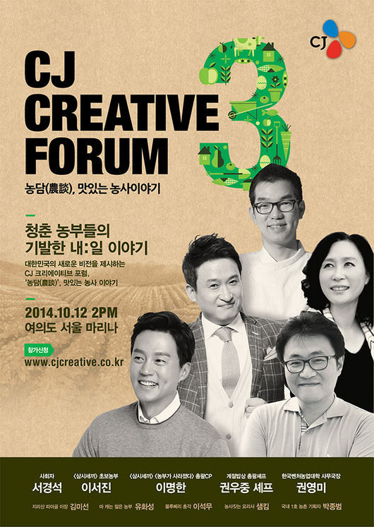 오는 12일 여의도 서울 마리나에서 개최되는 'CJ 크리에이티브 포럼 – 농담(農談), 맛있는 농사 이야기'에 참석을 원하는 신청자들이 쇄도하며 높은 관심을 증명하고 있다. CJ측은 지난 3일부터 공식 홈페이지와 CJ ONE 홈페이지을 통해 무려 1만 5천여명이 참가 신청을 했다고 밝혔다.