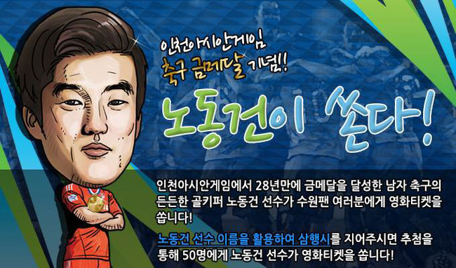 한편 수원은 8일 공식 페이스북을 통해 28년 만의 남자 축구 금메달을 축하하는 의미에서 아시안게임 대표팀의 노동건의 삼행시를 짓고 영화 관람권 200매를 증정하는 이벤트를 진행한다.