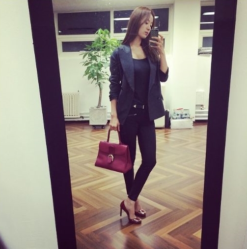 한지혜는 지난 7일 오후 자신의 인스타그램에 “로저비비에 와인컬러구두, 델보, 스키니 블랙진과 재킷. 오늘 결혼식하객패션”이라는 글과 함께 사진 한 장을 게재했다.
