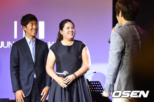 가수 정동하 쇼케이스 무대를 찾은 프로골퍼 박인비와 남기협 코치가 응원을 하고 있다.