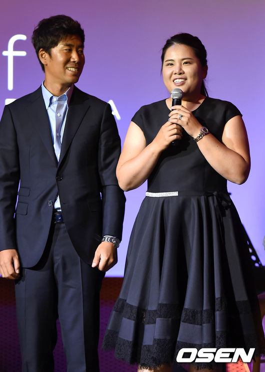 가수 정동하 쇼케이스 무대를 찾은 프로골퍼 박인비와 남기협 코치가 응원을 하고 있다.