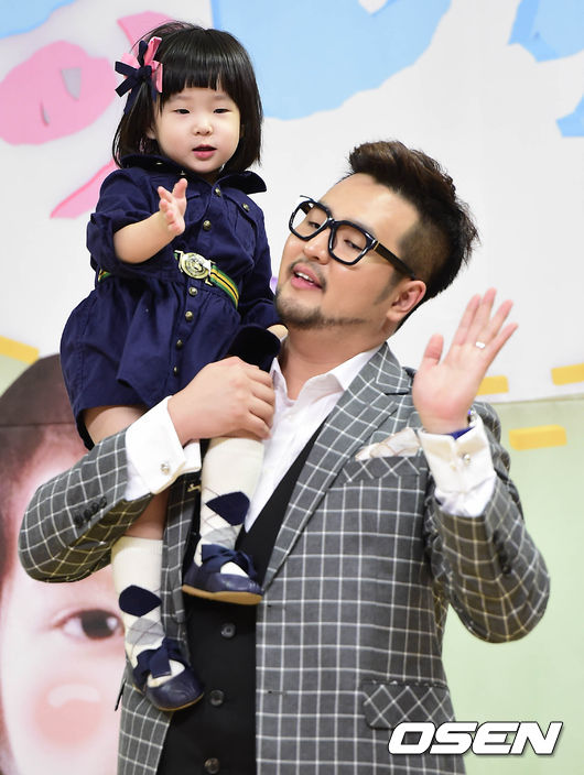 8일 오후 서울 목동 SBS 홀에서 열린 예능 패밀리 육아 리얼리티 쇼 '오마이베이비' 기자간담회에서 김태우와 딸 김소율과 포토타임을 갖고 있다.