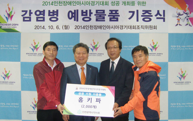 2014인천장애인아시아경기대회 조직위원회(위원장 김성일, 이하 조직위)는 8일 서정규 조직위 사무총장과 조석현 시약사회장, 조직위 관계자 등 20여명이 참석한 가운데 감영병 예방 물품 2000개 기증식을 갖고 대회 성공을 위한 상호 협력을 도모하기로 협의했다.