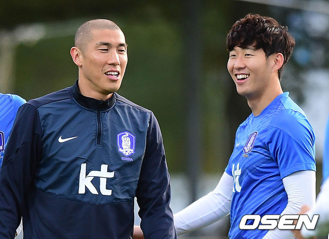 축구대표팀 차두리, 손흥민이 8일 오후 파주 NFC(국가대표 트레이닝센터)에서 훈련 중 미소를 짓고 있다.