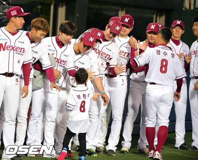 8일 오후 서울 목동구장에서 열린 2014 한국야쿠르트 세븐 넥센 히어로즈와 삼성 라이온즈의 경기에 앞서 은퇴식을 가진 정수성이 동료들과 하이파이브를 하고 있다