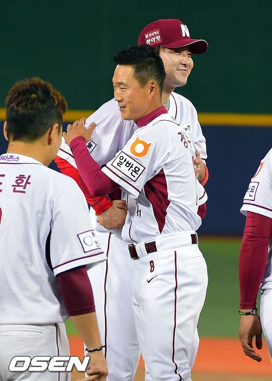 8일 오후 서울 목동구장에서 열린 2014 한국야쿠르트 세븐 넥센 히어로즈와 삼성 라이온즈의 경기에 앞서 은퇴식을 가진 정수성이 박병호와 포옹을 하고 있다