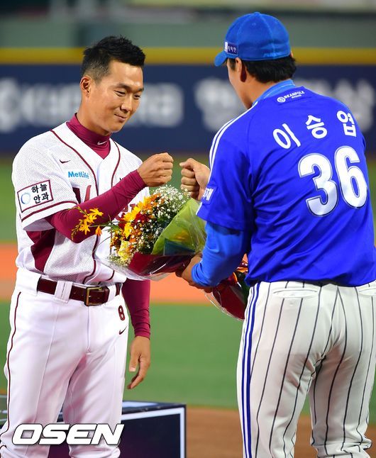 8일 오후 서울 목동구장에서 열린 2014 한국야쿠르트 세븐 넥센 히어로즈와 삼성 라이온즈의 경기에 앞서 은퇴식에서 이승엽이 정수성에게 꽃다발을 전달하고 있다.