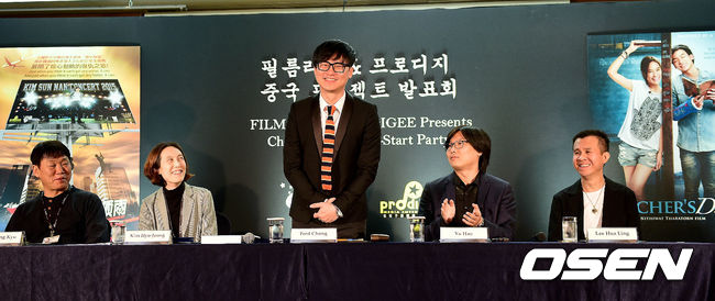 안동규 두타연 영화사 대표, 김효정 필름라인 프로듀서, 프레드 청 프로디지미디어 대표, 위하오 중국 피닉스레전드 부사장, 리 후아 링 프리디지미디어 베이징 부사장(사진 왼쪽부터)이 인사말을 하고 있다.