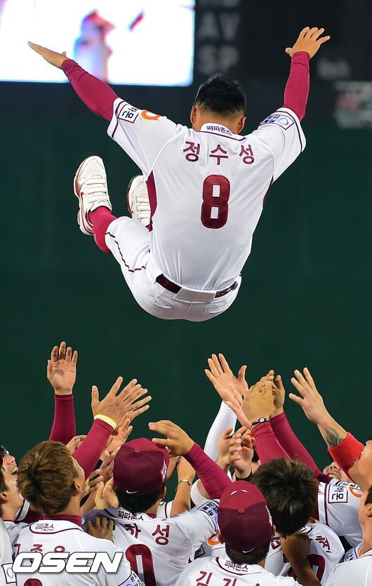 8일 오후 서울 목동구장에서 열린 2014 한국야쿠르트 세븐 넥센 히어로즈와 삼성 라이온즈의 경기에 앞서 은퇴식에서 정수성이 헹가래를 받고 있다.