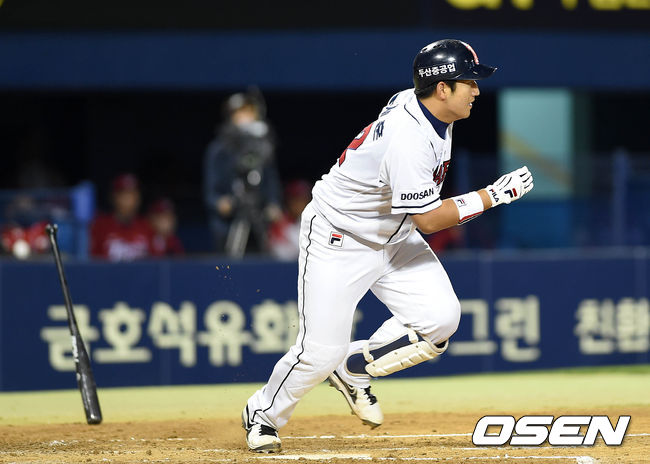 2회말 1사 2,3루에서 두산 최재훈이 내야땅볼을 치고 달리고 있다.