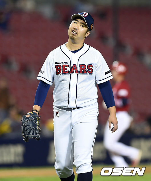 3회초 2사 1,2루에서 두산 유희관이 KIA 필을 외야플라이로 처리하고 더그아웃으로 가고 있다.