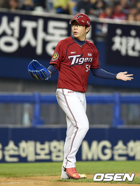 4회말 1사 1,2루에서 두산 김재호에게 중전적시타를 허용한 KIA 양현종이 아쉬운 표정을 짓고 있다.