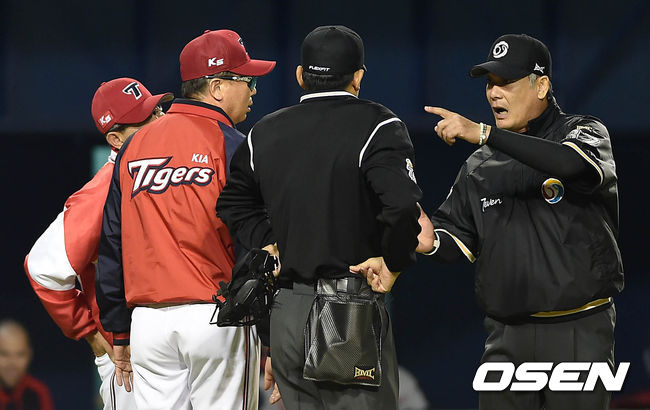 5회말 무사 1루 KIA 신종길의 도루실패 판정때 선동렬 감독이 심판진에 강하게 어필하고 있다.