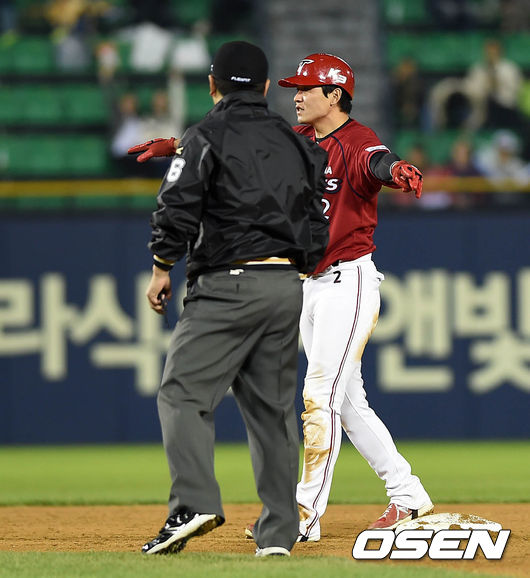 5회말 무사 1루에서 KIA 신종길이 도루 실패 판정에 강하게 어필하고 있다.
