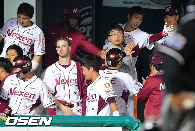 8일 오후 서울 목동구장에서 열린 2014 한국야쿠르트 세븐 넥센 히어로즈와 삼성 라이온즈의 경기, 6회말 1사 1루 넥센 유한준의 선취 1타점 적시타때 홈을 밟은 이택근이 동료들의 축하를 받고 있다.