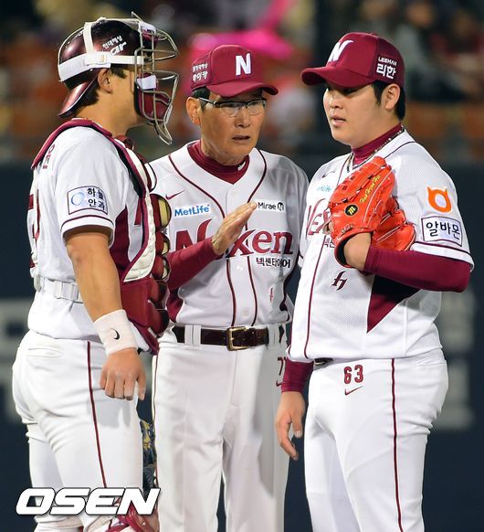 8일 오후 서울 목동구장에서 열린 2014 한국야쿠르트 세븐 넥센 히어로즈와 삼성 라이온즈의 경기, 7회초 2사 만루위기에서 넥센 류영수 투수코치가 마운드에 올라 한현희와 이야기를 나누고 있다.