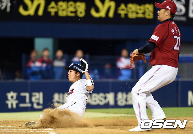6회말 2사 1,3루에서 두산 3루주자 정수빈이 KIA 송은범의 폭투를 틈타 홈을 밟고 있다.