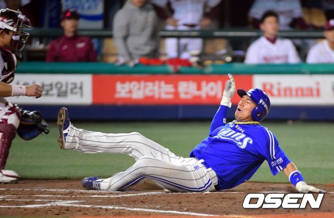 8일 오후 서울 목동구장에서 열린 2014 한국야쿠르트 세븐 넥센 히어로즈와 삼성 라이온즈의 경기, 8회초 1사 1루 삼성 박한이의 1타점 적시타때 1루 주자 김상수가 홈세이프되고 있다.