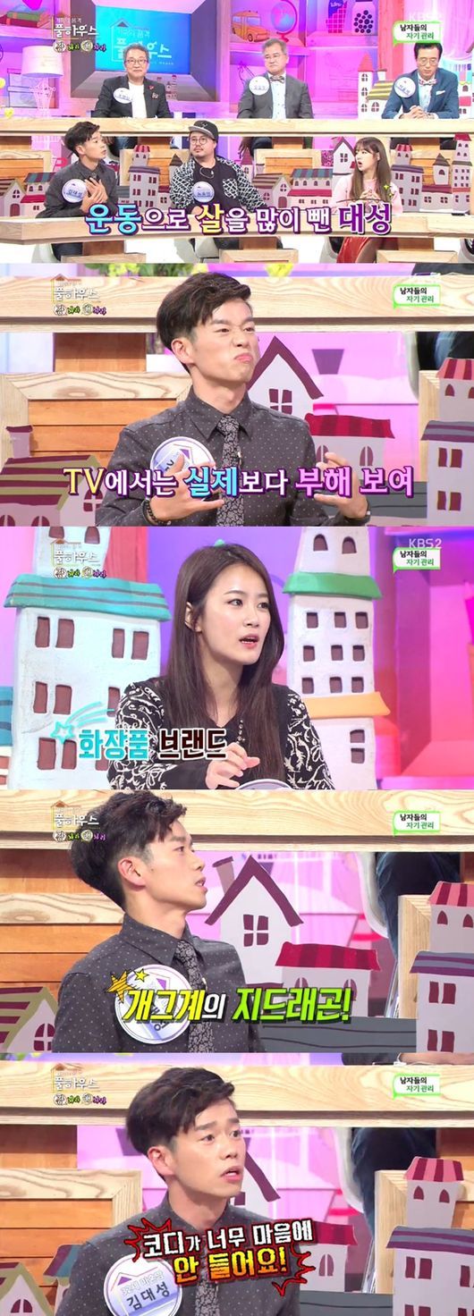 김대성은 “TV에서는 실제보다 부하게 나온다”라며 체중감량을 하고 있는 이유를 덧붙였다. 이에 김지민은 “김대성이 화장품이나 브랜드 여자들의 취향을 연구해서 잘 안다. 개그맨 중에서도 남다른 패션감각을 지니고 있다”며 그를 개그계의 지드래곤으로 꼽아 눈길을 끌었다.