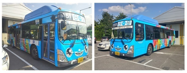 ‘타요버스’는 어린이들의 사랑을 받은 ‘꼬마버스 타요’의 캐릭터를 재디자인하여 실제 운행버스에 적용한 것으로서, 이번에는 한글 디자이너 이건만 씨의 재능기부를 통해 한글과 전통문양의 소재로 재탄생하였다.