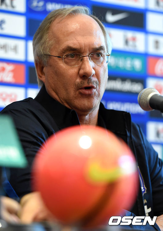 한국 슈틸리케 감독이 취재진의 질문에 답을 하고 있다.