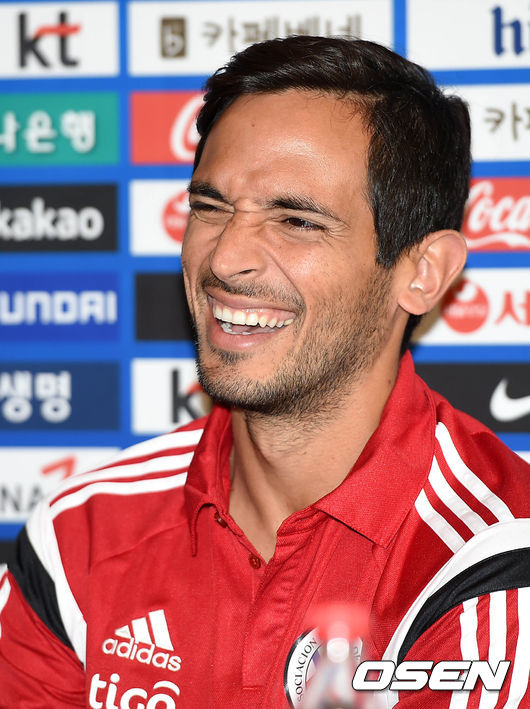 파라과이 로케 산타 크루스가 "잘생긴 외모로 한국 여성팬들에게 인기가 많다는 사실을 아는지"란 취재진의 질문에 미소를 지으며 답을 하고 있다.