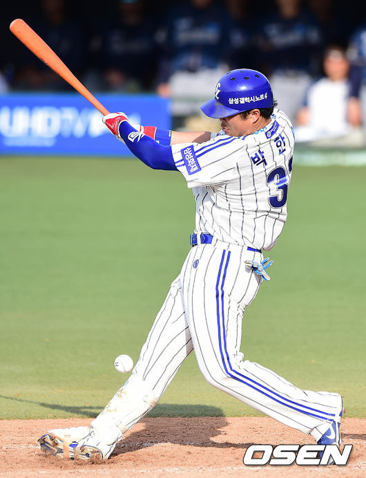 5회말 삼성 공격 1사 1, 2루 상황 박한이가 자신이 친 파울타구에 몸을 맞고 있다.
