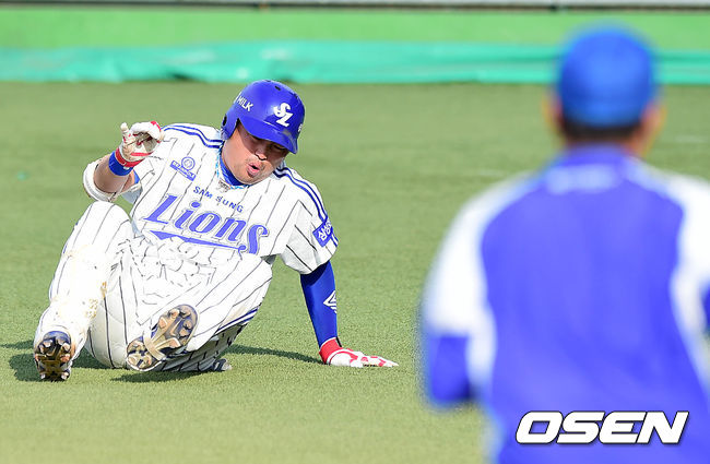 5회말 삼성 공격 1사 1, 2루 상황 박한이가 자신이 친 파울타구에 몸을 맞은 뒤 괴로워하고 있다.