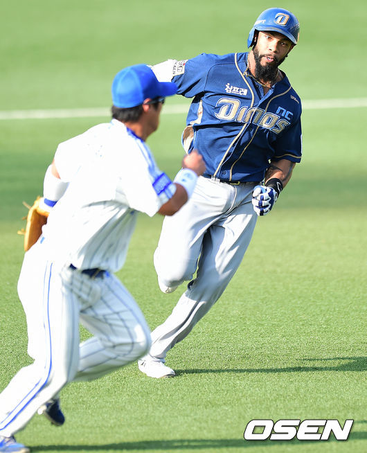 6회초 NC 공격 1사 주자없는 상황 테임즈가 좌중간을 가르는 인사이드 더 파크 홈런을 치고 전력질주하고 있다.