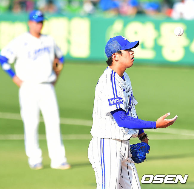 6회초 NC 공격 2사 1루 상황 권희동에게 역전 중월 투런포를 허용한 삼성 선발 윤성환이 아쉬워하고 있다.