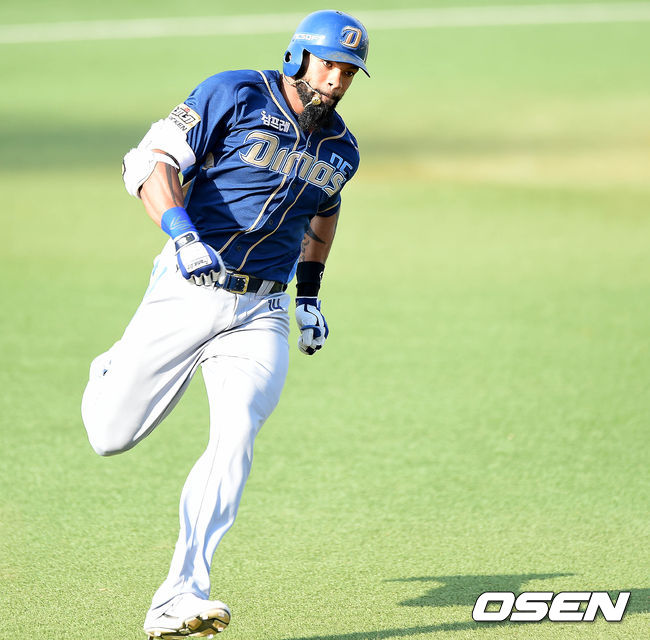 6회초 NC 공격 1사 주자없는 상황 테임즈가 좌중간을 가르는 인사이드 더 파크 홈런을 치고 전력질주하고 있다.