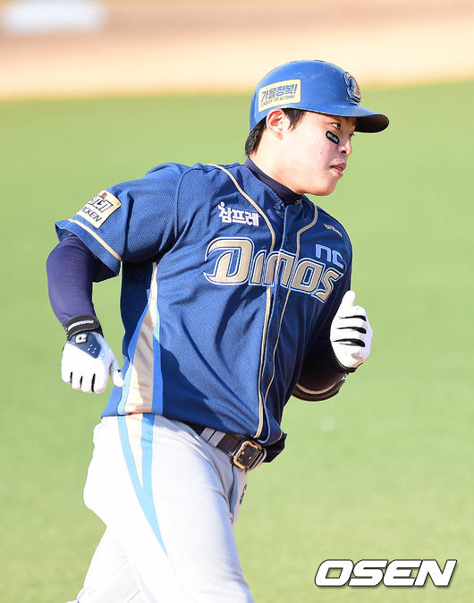 6회초 NC 공격 2사 1루 상황 권희동이 역전 중월 투런포를 날리고 그라운드를 돌고 있다.