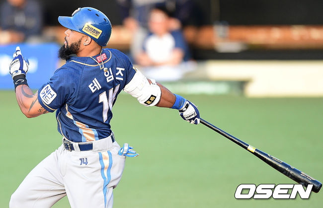 9회초 NC 공격 선두타자로 나선 테임즈가 우전안타를 날리고 있다.