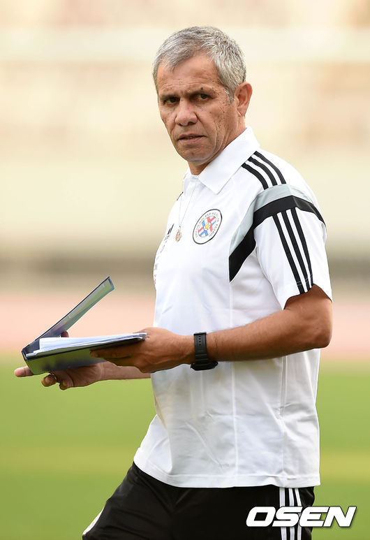 파라과이 훈련에 앞서 빅토르 헤네스 감독이 그라운드로 가고 있다.