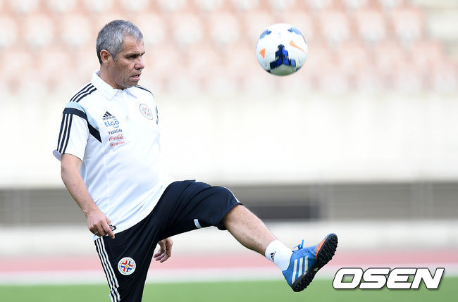 파라과이 훈련에 앞서 빅토르 헤네스 감독이 볼트래핑을 하고 있다.