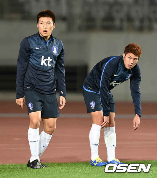 한국 이명주와 김승대가 훈련을 하고 있다.