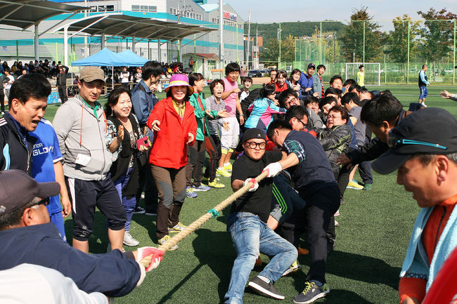 글로벌 종합물류유통기업 현대글로비스가 9일 충남 당진 상록수공원과 울산 울주군 상북면민운동장에서 아산, 울산KD센터와 협력사 임직원 600여 명이 참석한 가운데 ‘협력사 상생 협력 및 유대 강화를 위한 한마음 체육대회’를 가졌다. 현대글로비스 울산KD센터 임직원과 협력사 직원들이 줄다리기를 하고 있다. /현대글로비스 제공.