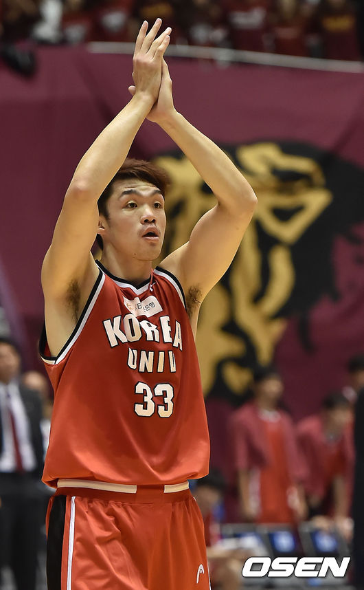 10일 오후 서울 잠실실내체육관에서 열린 연세대-고려대 농구 정기전에서 고려대 이승현이 박수를 보내고 있다.