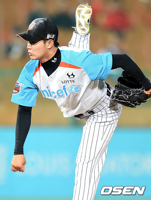 5회초 NC 공격 무사 1루 때 마운드에 오른 롯데 투수 강승현이 힘차게 공을 뿌리고 있다.
